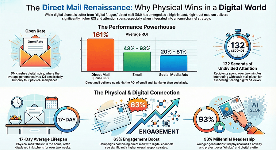 The numbers that keep coming up: 98% open rate. 161% ROI. 132 seconds of undivided attention. A mail piece that lingers in the home for 17 days versus the 3 seconds an email gets before the delete key.
