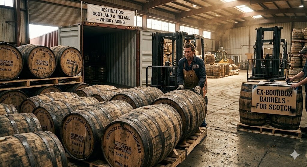 The ex-bourbon barrel imparts vanilla, caramel, and oak character to single malts. Distilleries like Glenfiddich and Jameson depend on this supply chain. The