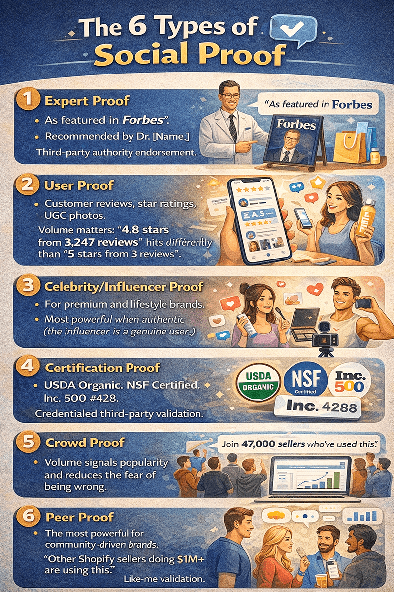Peer proof. The most powerful for community-driven brands. "Other Shopify sellers doing $1M+ are using this." Like-me validation.